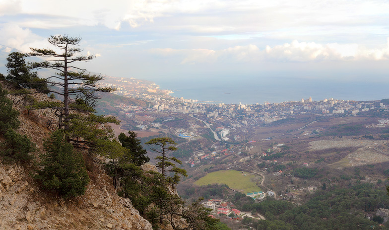 Утром тумана уже не было, но и солнце скрылось за облаками, лишь изредка пятнами освещая пейзаж с Ялтой.